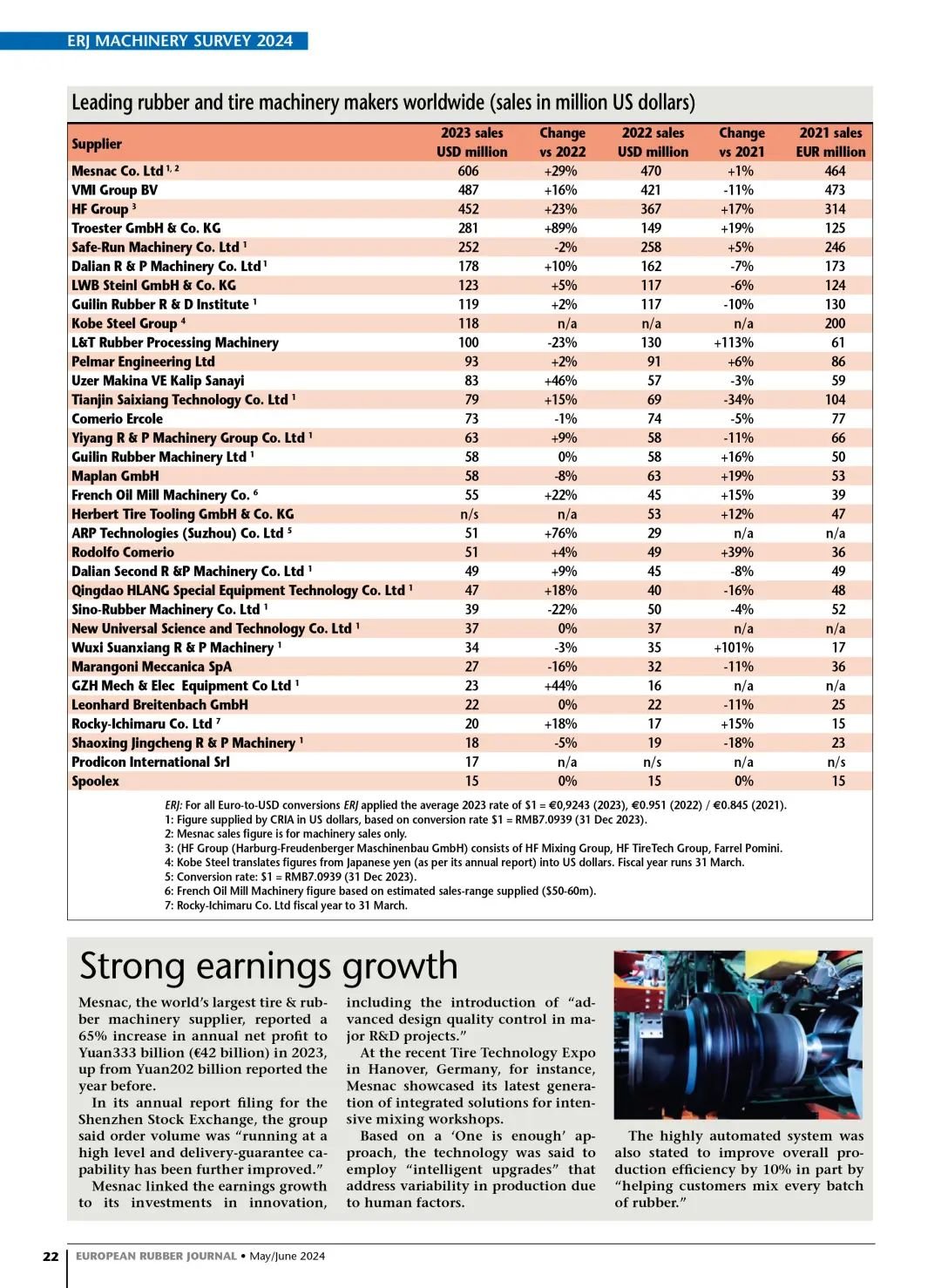 在最新出版的欧洲橡胶杂志(European Rubber Journal) 5/6月刊,公布了2023年全球橡胶机械行业企业的销售收入排名,6686体育网页登录(MESNAC)蝉联榜首。