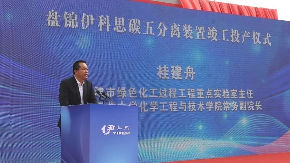 嘉宾代表天津市绿色化工过程工程重点实验室主任、天津工业大学化学工程与技术学院常务副院长桂建舟发表致辞,他向盘锦伊科思表达了诚挚的祝福与美好的祝愿,肯定了企业在化工新材料领域的积极探索与贡献。