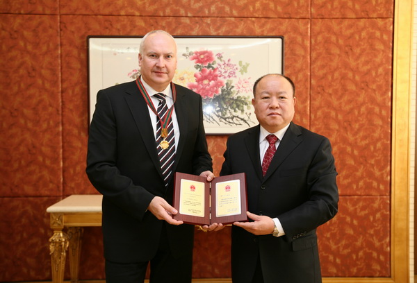 1月13日,国家外国专家局副局长刘延国为获得2011年中国政府“友谊奖”的斯洛伐克专家Karol Vanko先生补授了奖牌与奖章。