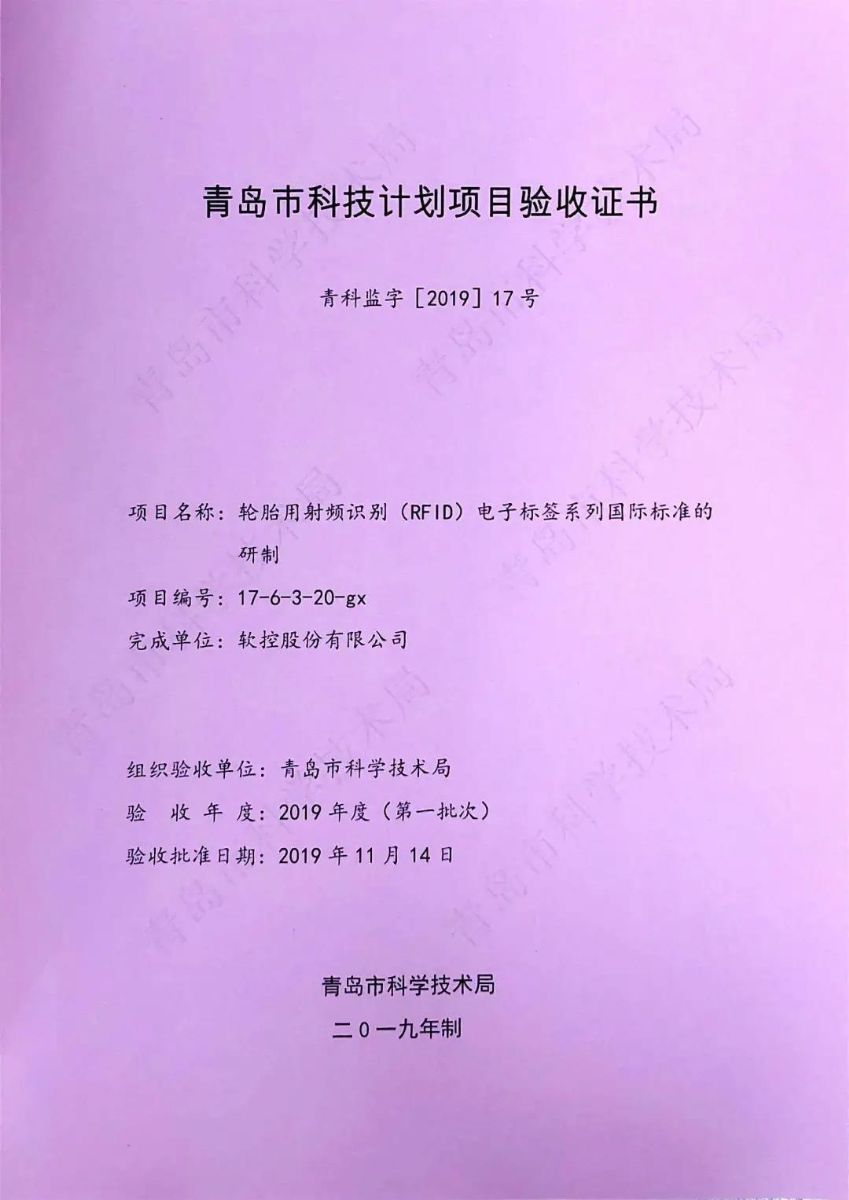 近日,6686体育网页登录承担的2017年青岛市民生科技计划项目“轮胎用射频识别(RFID)电子标签系列国际标准的研制”顺利完成全部验收工作,青岛市科学技术局下发青岛市科技计划项目验收证书。